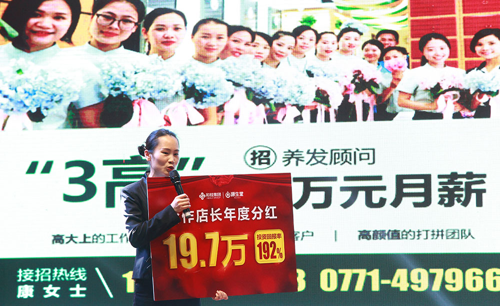 現(xiàn)場,和桂集團(tuán)總裁黃偉文先生、源生堂執(zhí)行總經(jīng)理舒志華女士,為源生堂幾十位優(yōu)秀合作店長代表,進(jìn)行2017年度百萬分紅頒獎(jiǎng)。幾十位優(yōu)秀合作店長上臺領(lǐng)取個(gè)人年度分紅,除去工資后,最高個(gè)人年度分紅可達(dá)19萬元,引發(fā)全場尖叫與歡呼!舒總分享了《2018源生堂三大招》,現(xiàn)場招募養(yǎng)發(fā)顧問、合作店長、加盟老板,現(xiàn)場嘉賓及家人紛紛轉(zhuǎn)發(fā)分享。最后,黃總表示,2018年用分享成就未來,讓更多人實(shí)現(xiàn)老板夢。