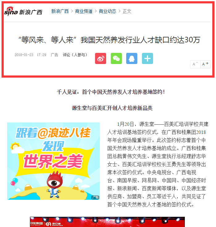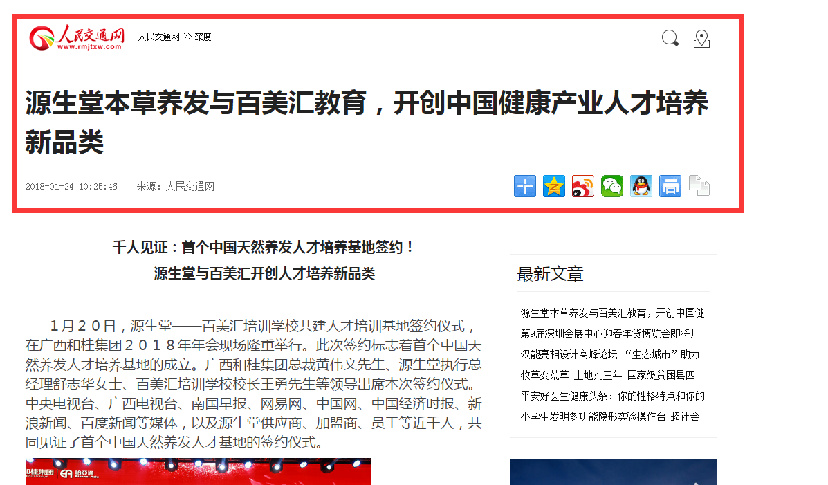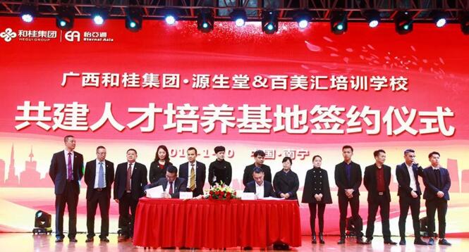 1月20日,源生堂與百美匯培訓(xùn)學校共建人才培訓(xùn)基地簽約儀式,在廣西和桂集團2018年年會現(xiàn)場隆重舉行。此次簽約標志著首個中國天然養(yǎng)發(fā)人才培養(yǎng)基地的成立。廣西和桂集團總裁黃偉文先生、源生堂執(zhí)行總經(jīng)理舒志華女士、百美匯培訓(xùn)學校校長王勇先生等領(lǐng)導(dǎo)出席本次簽約儀式。中央電視臺、廣西電視臺、南國早報、網(wǎng)易網(wǎng)、中國網(wǎng)、中國經(jīng)濟時報、新浪新聞、百度新聞等媒體,以及源生堂供應(yīng)商、加盟商、員工等近千人,共同見證了首個中國天然養(yǎng)發(fā)人才基地的簽約儀式。